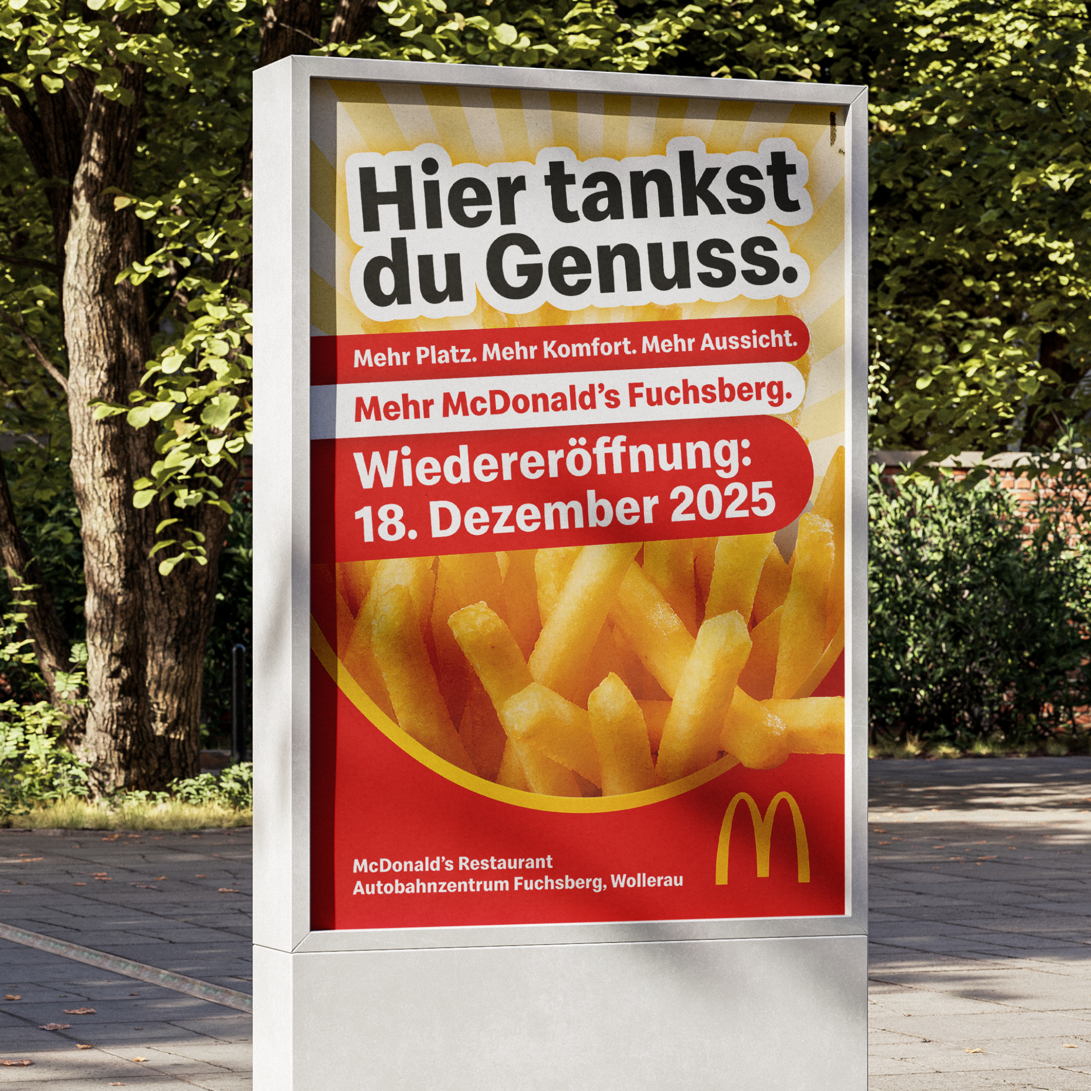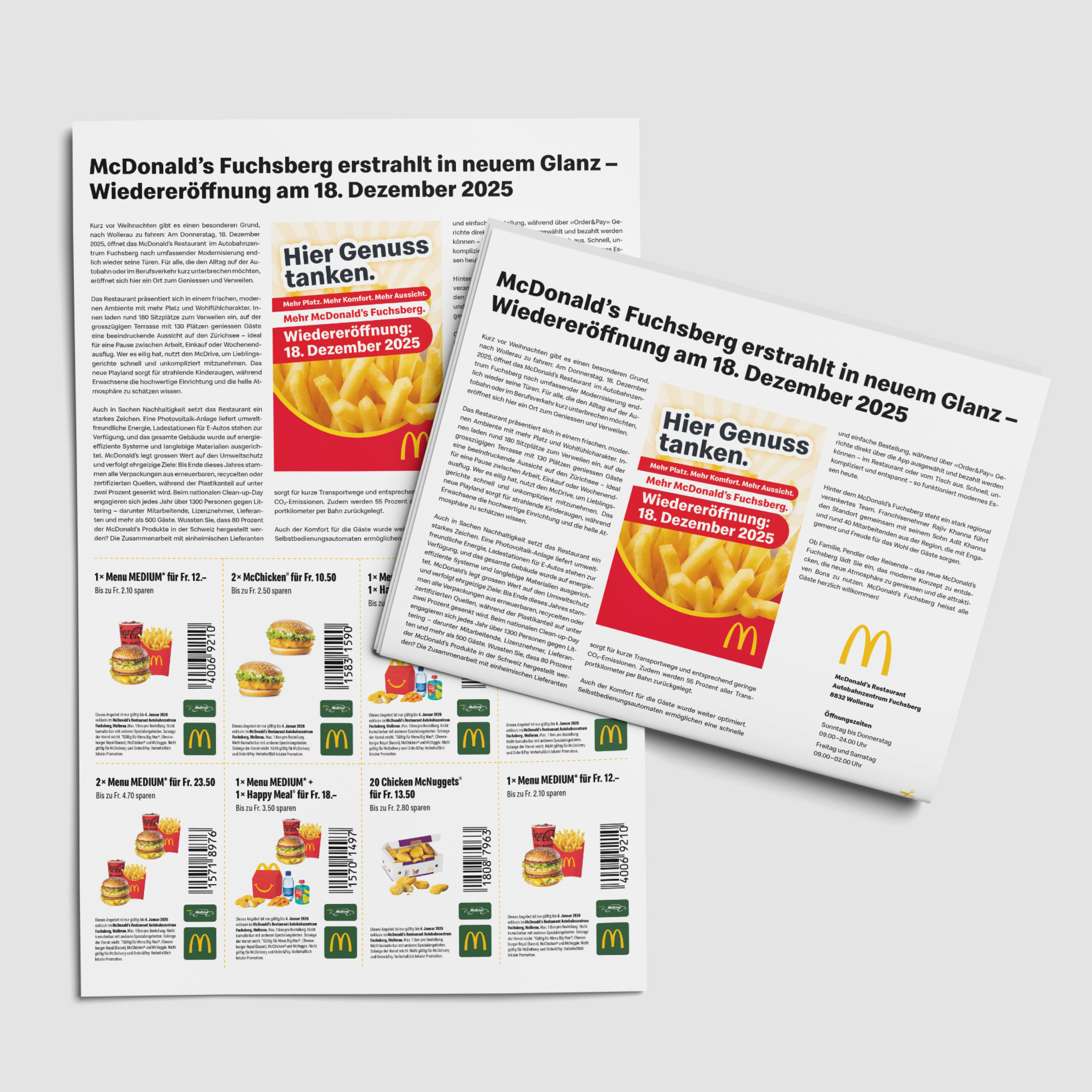 In Wollerau ist nicht einfach ein McDonald’s zurückgekehrt – es ist ein neues Restaurant-Erlebnis entstanden: grösser, moderner, ein echter Blickfang mit Terrasse über den Zürichsee. Wir durften die Wiedereröffnung von A bis Z kommunikativ begleiten – von regionalen Plakaten über PR und Print-Werbung bis zu Google Display Ads. Das Resultat: hohe Aufmerksamkeit, starke Frequenz und ein starker Start zur Wiedereröffnung!