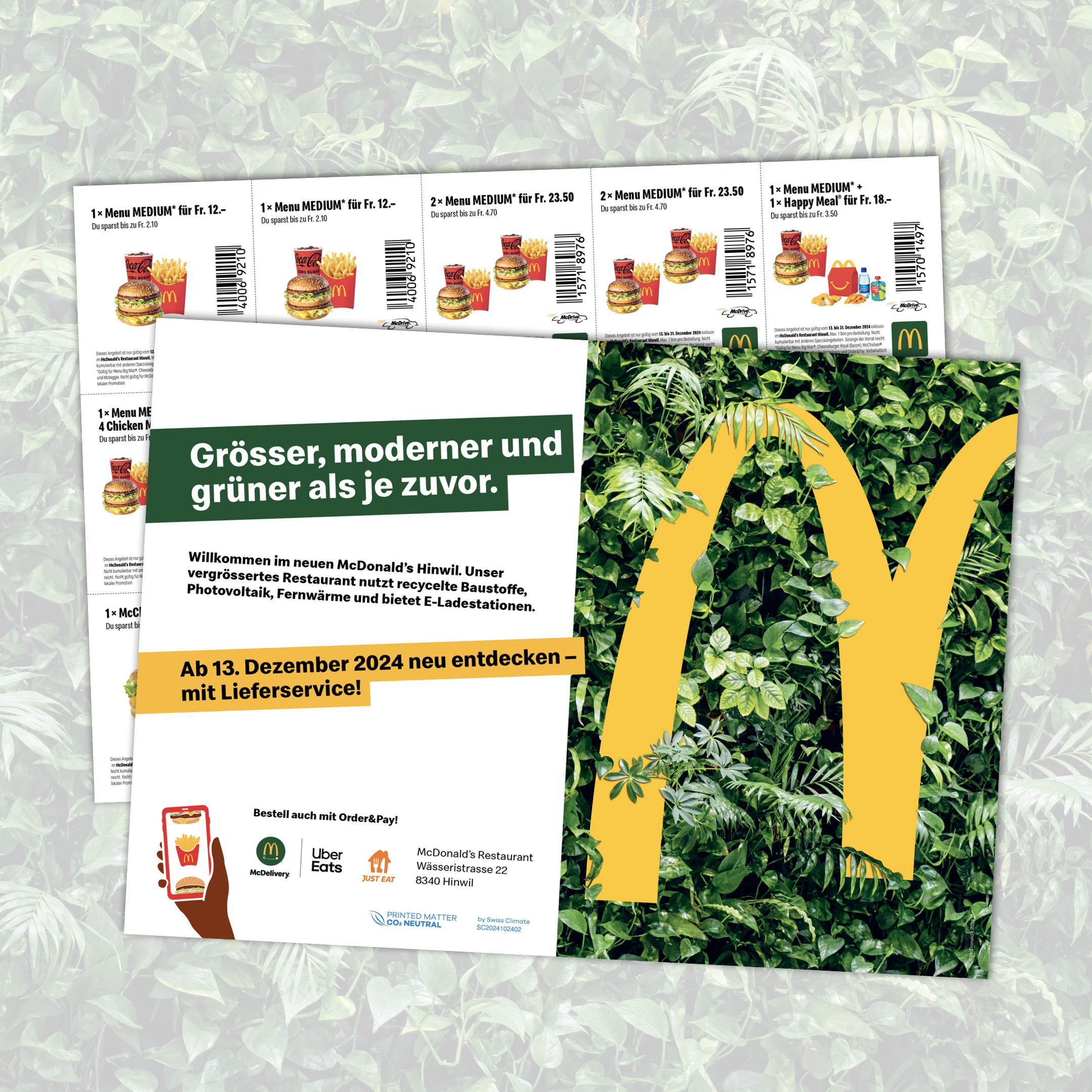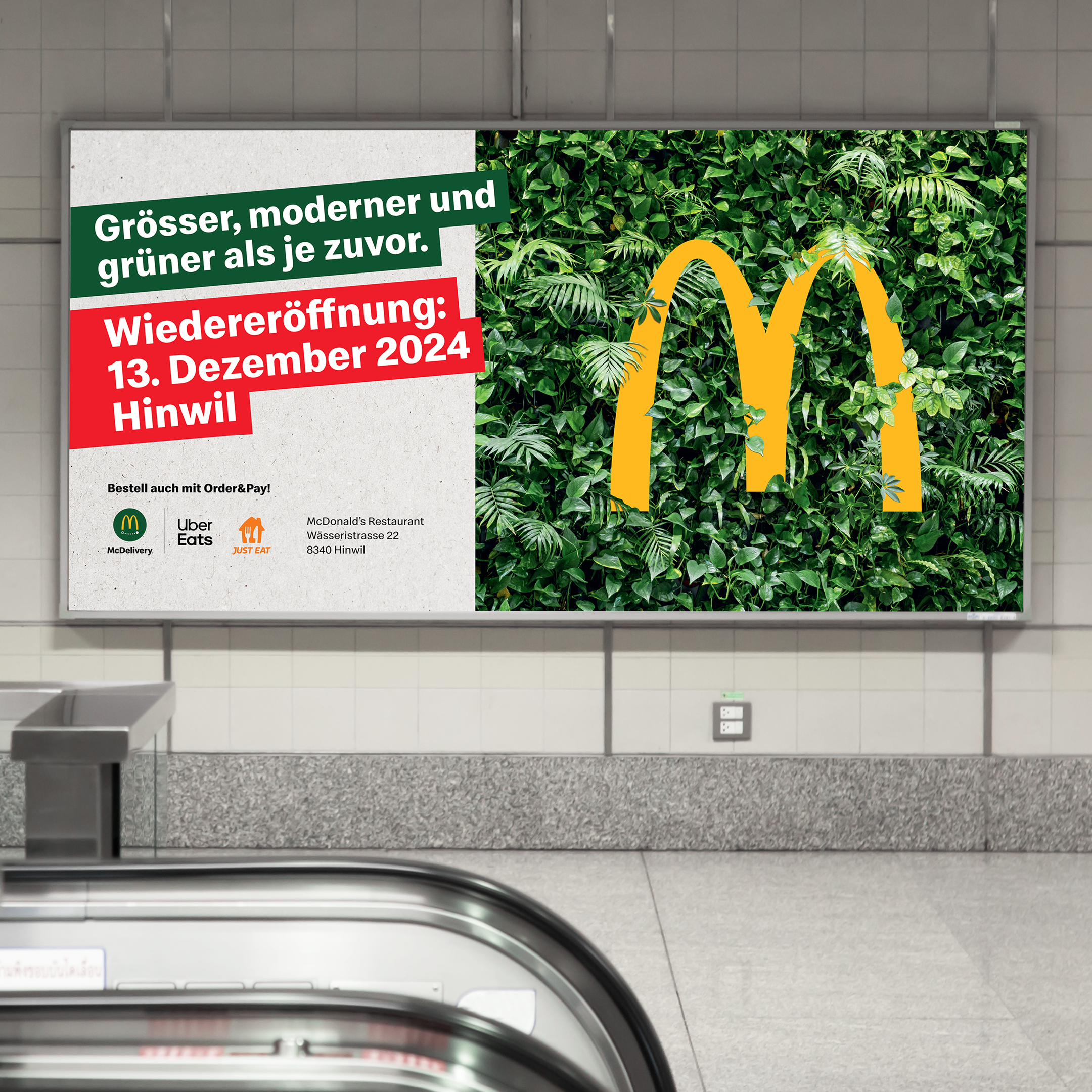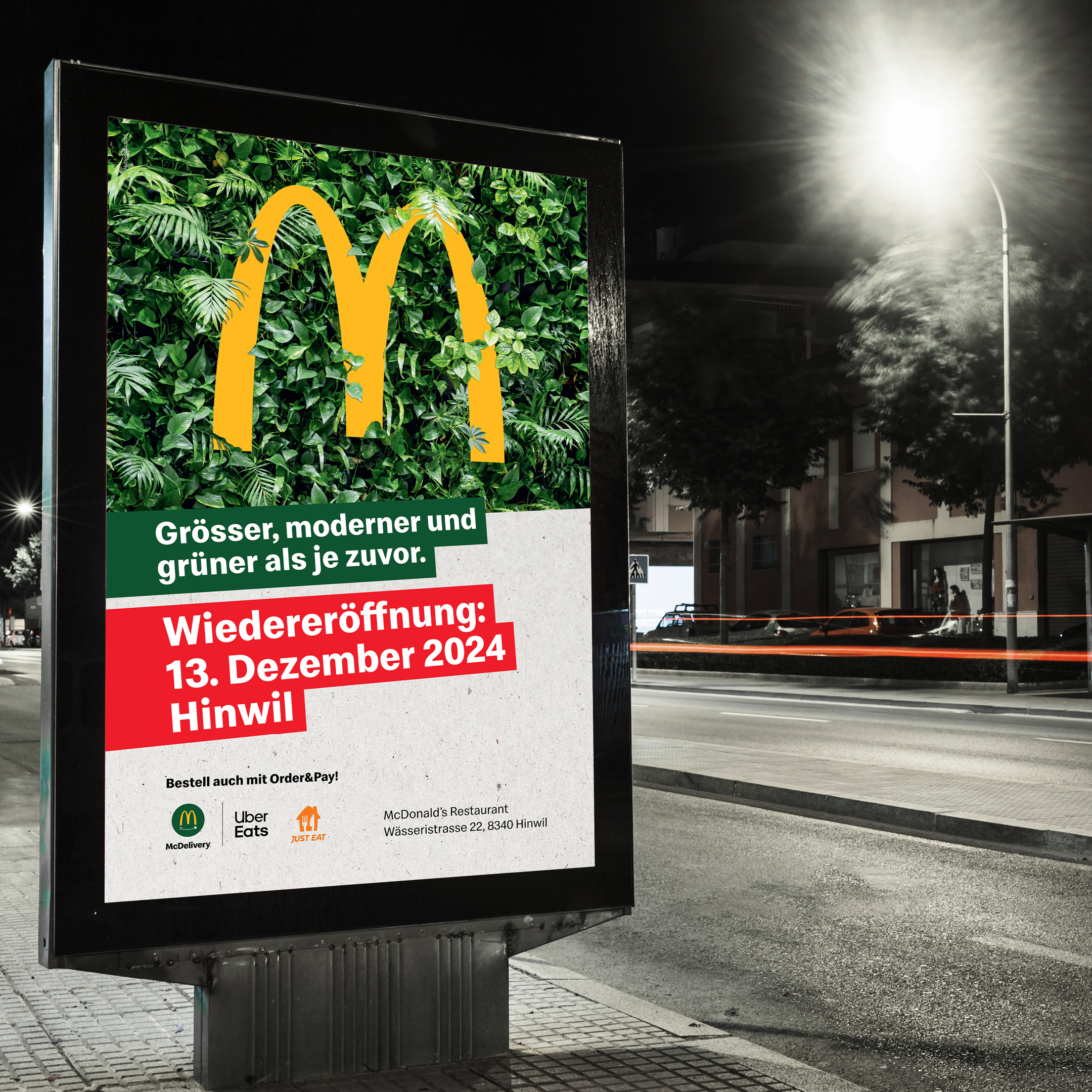 Following extensive remodelling, the McDonald‘s restaurant in Hinwil is now more modern and environmentally friendly than ever. Highlights such as a photovoltaic system, recycled building materials and e-charging stations set new standards for sustainable gastronomy. Our task was to realise the entire regional communication campaign for the renovation and reopening: From eye-catching posters to sales promotion in the form of newspaper inserts, targeted PR measures through to digital content and online marketing, we set the scene for the transformation of the location. The result? A regional campaign that successfully communicates the message of the new concept and makes people want to visit. We wish McDonald‘s Hinwil every success and are delighted to have been a part of this pioneering project!